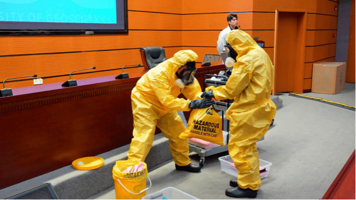 曹志伟逐步讲解并指导模拟人员实操演练,以实验室的500毫升浓硫酸洒溢为例,详细介绍了危险化学品洒溢的应急处理流程和方法。演练过程中,8名同学扮演学院、实验室的学生、实验教师、应急人员等不同角色,模拟了事故发生、疏散、上报、专业处置、恢复实验室运行的全过程,并生动展示了大家容易疏忽的安全细节。在场师生认真观看并纷纷拍摄、记录、学习。本次活动既检验了应急预案的可操作性,也增强了师生的实战能力。