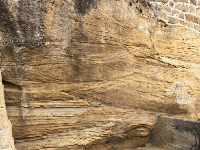 11月8日,在延安清凉山,教师团队观察了中侏罗世延安组的灰白色—黄灰色砂岩地层。该套地层是华北地区重要的含煤地层之一,形成于约1.74亿至1.64亿年前的河流—湖泊三角洲环境。厚层砂岩中发育典型的楔状、槽状交错层理,记录了古河流的迁移与沉积过程。教师们现场讨论了砂岩的成因、结构及其在油气储层与革命历史中的双重意义。